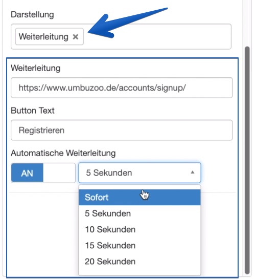 Das Informationselement auf der letzten Seite bietet bei der "Darstellung" eine Einstellung für die Weiterleitung: